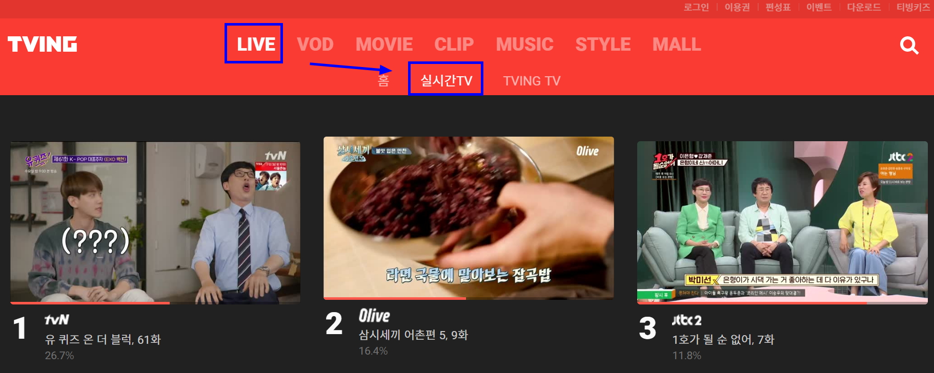 먼저 종편, 케이블은 Tving(티빙)에서 보고 싶은 채널을 거의 다 볼 수 있습니다. tvN, jtbc, 채널A, YTN, 올리브, OCN 등 다양한 채널을 시청 할 수 있습니다.