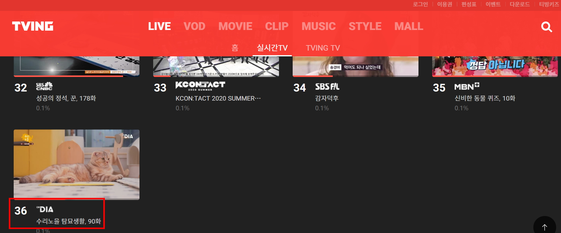 티빙 사이트에서 라이브방송 메뉴안에 있는 실시간티비 메뉴에서 현재 36개 채널을 무료로 시청 할 수 있습니다.