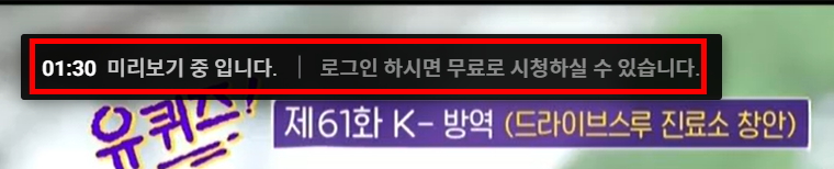 위 채널 중 하나를 클릭 해 봤습니다. 먼저 미리보기 1분 30초가 시청 할 수 있고 안내처럼 로그인을 하면 무료로 시청 할 수 있습니다. 유료상품도 있지만 대부분 무료로 시청가능 하기 때문에 무료가입 해 두면 유용하게 볼 수 있습니다.