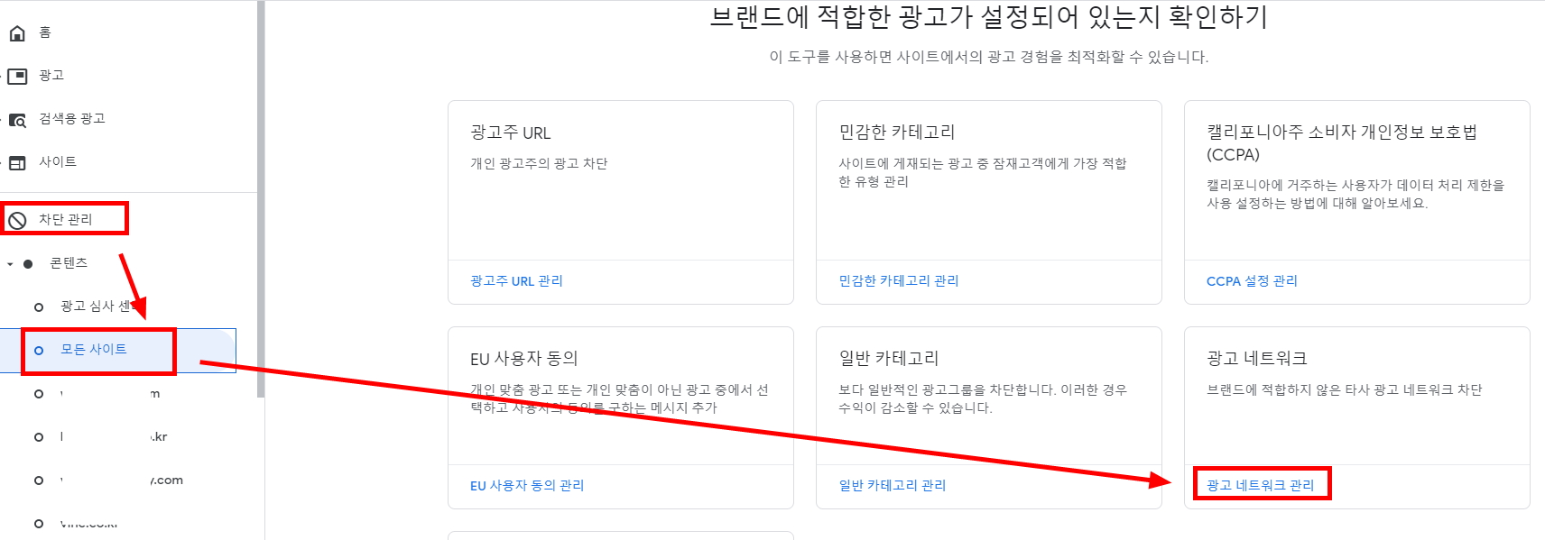 1) 구글애드센스 로그인 >> 차단관리 >> 모든사이트 >> 광고네트워크 관리