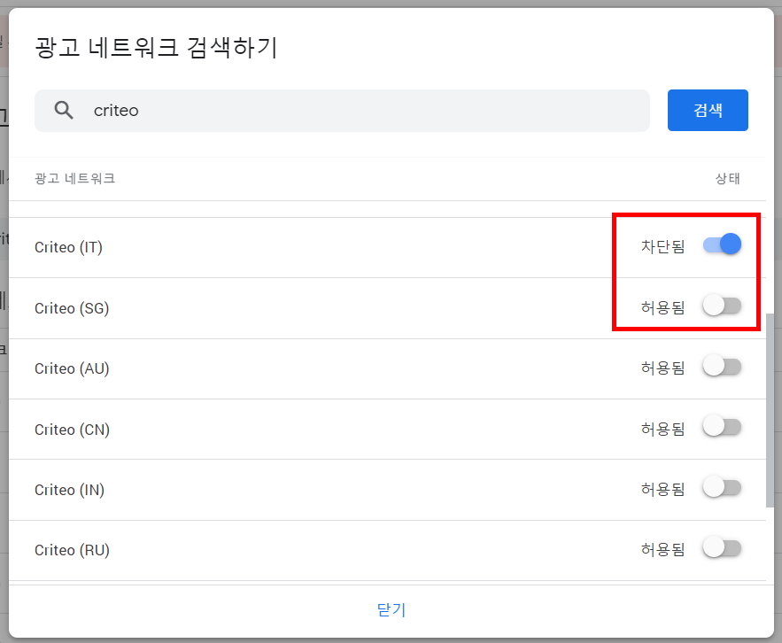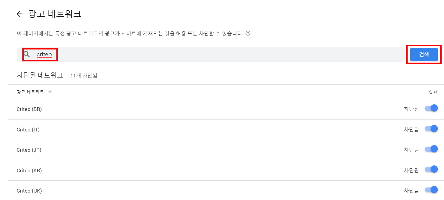 2) 광고네트워크 관리 >> Criteo 검색 >> 차단시키기